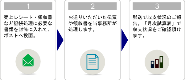 売上帳票、領収書や伝票をご郵送いただくだけ。